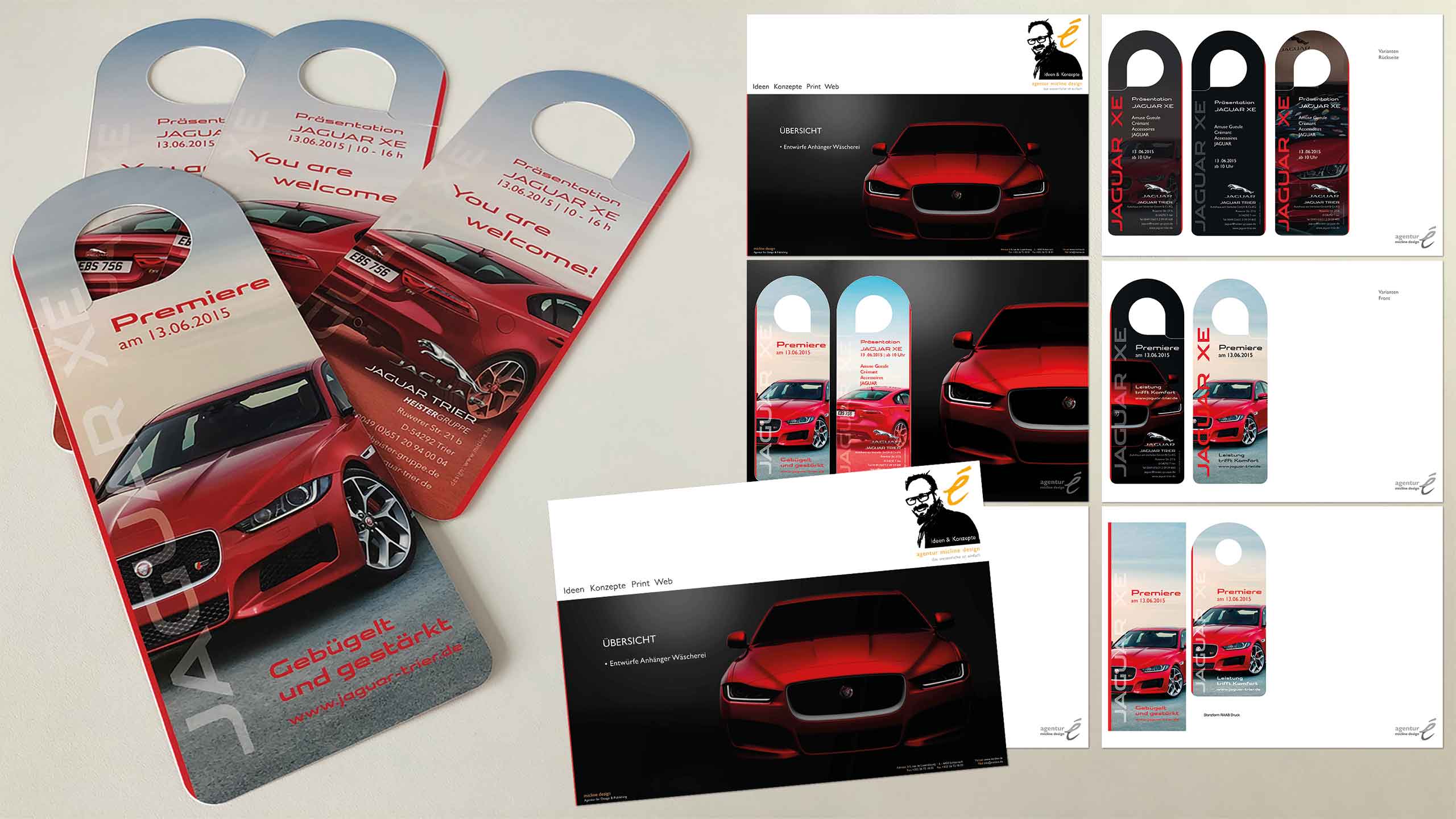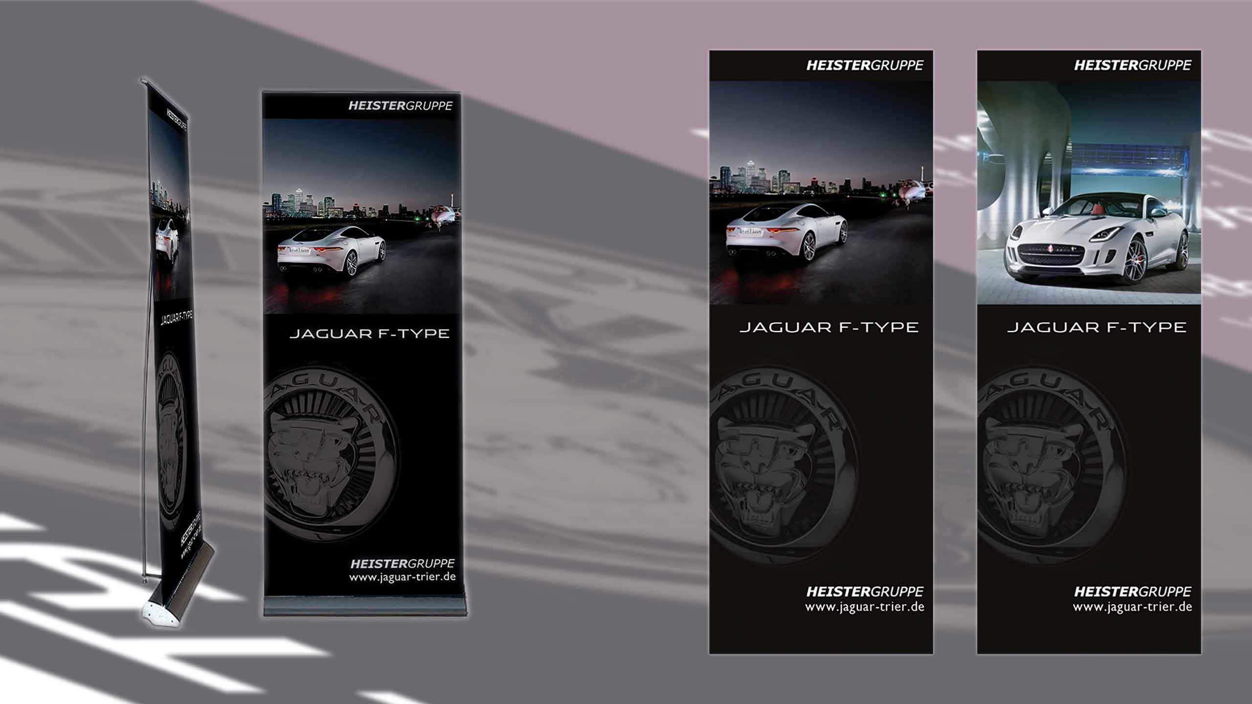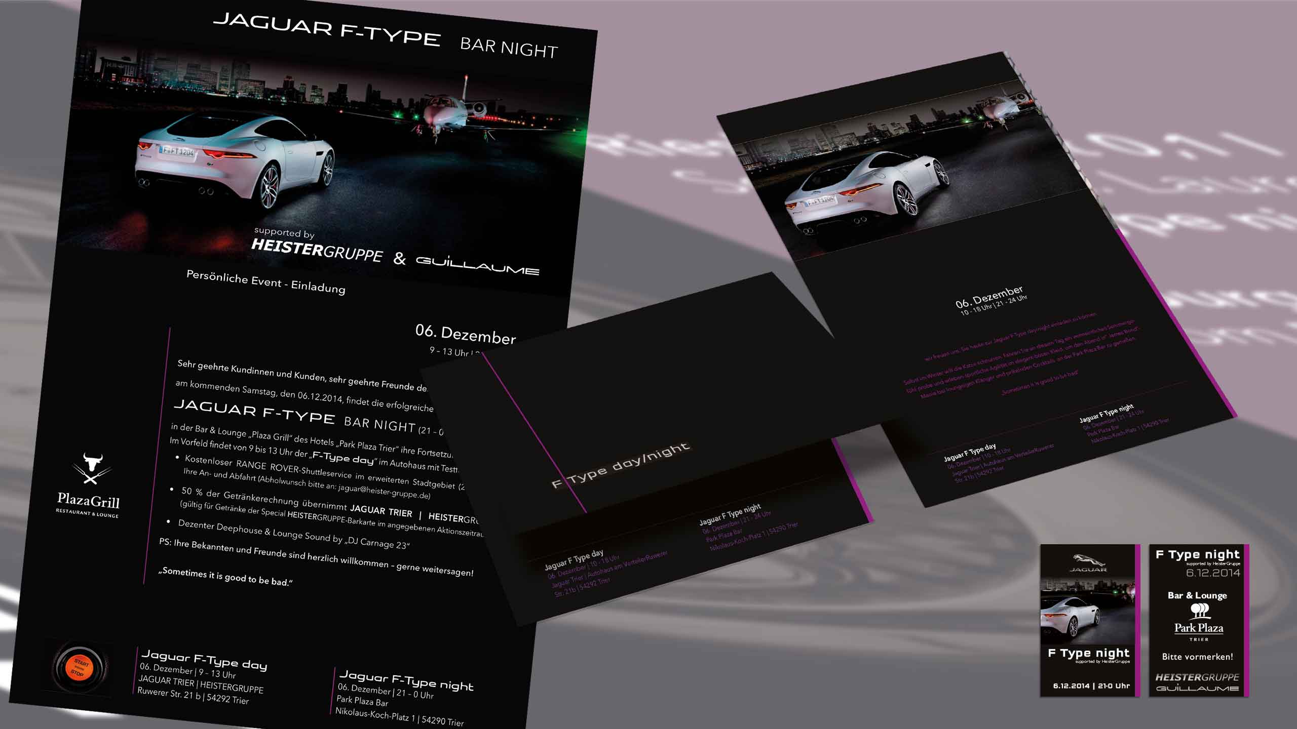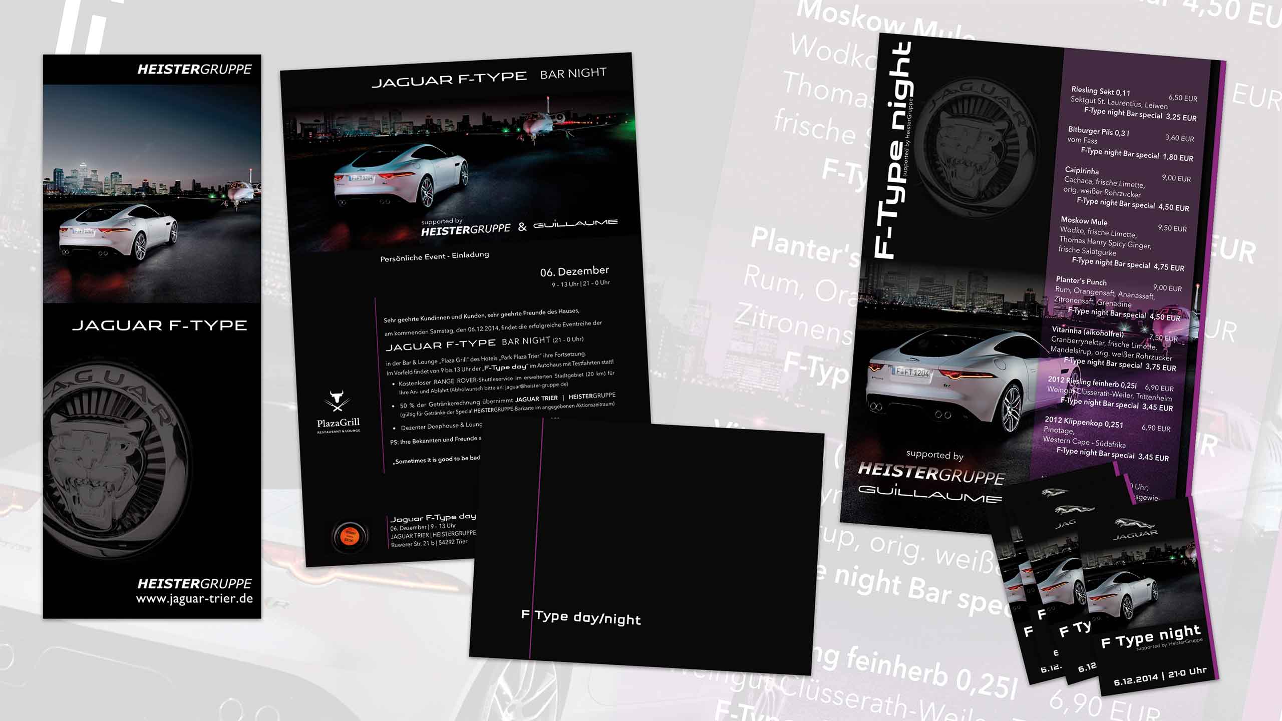Wir konnten verschiedene Veranstaltungen von JAGUAR und LAND ROVER der HEISTER Gruppe Trier kreativ unterstützen. Es entstanden ansprechende und stilvolle „Save the date“-Karten, Einladungen, diverse Roll Ups, Plakate, Getränkekarten und Werbeanhänger, die als Marketingaktion in Wäschereien an Hemden potentielle Interessenten auf die Veranstaltungen aufmerksam machten. Das Design sollte der Eleganz und Hochwertigkeit der Luxuskarossen in nichts nachstehen.