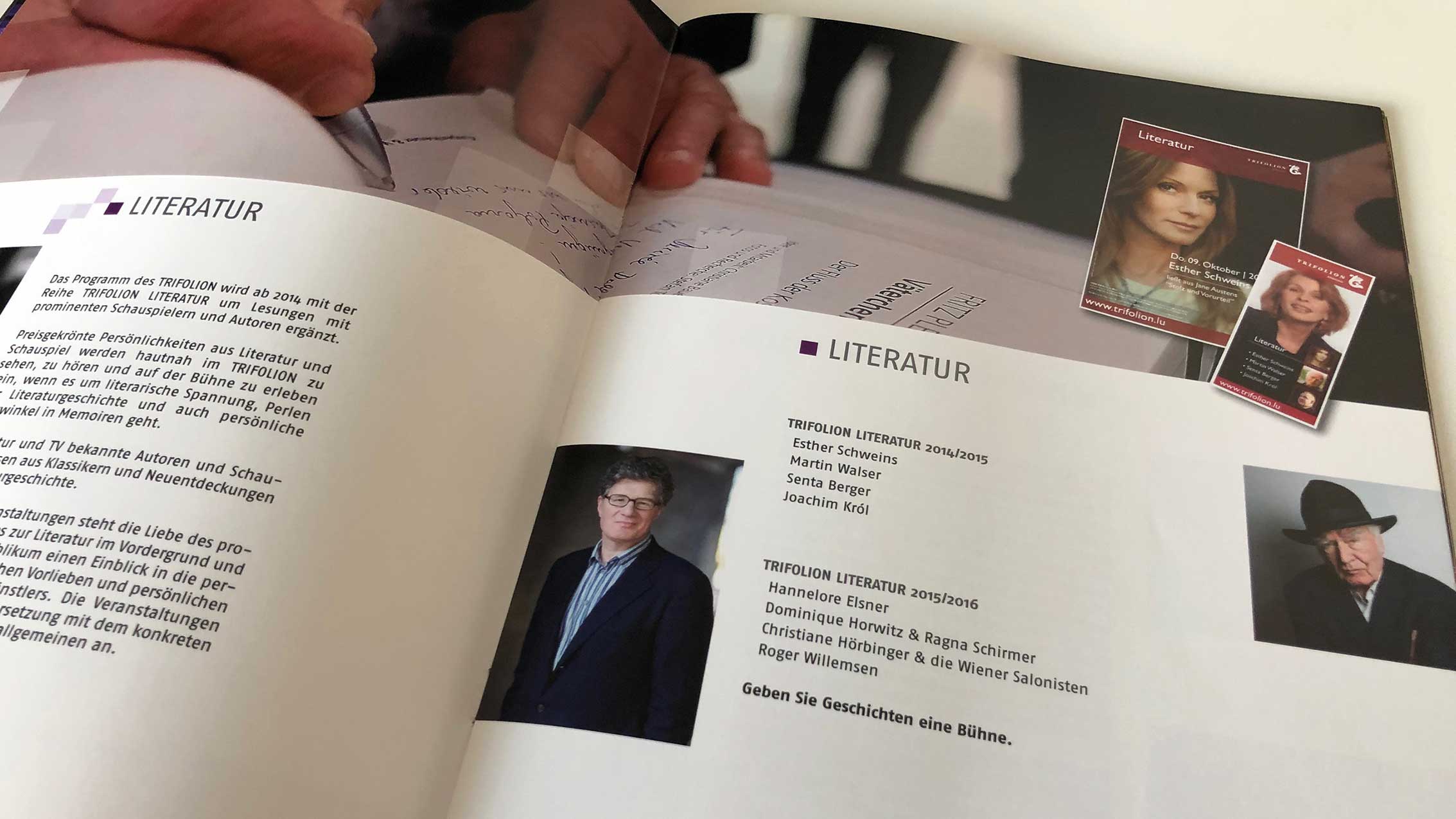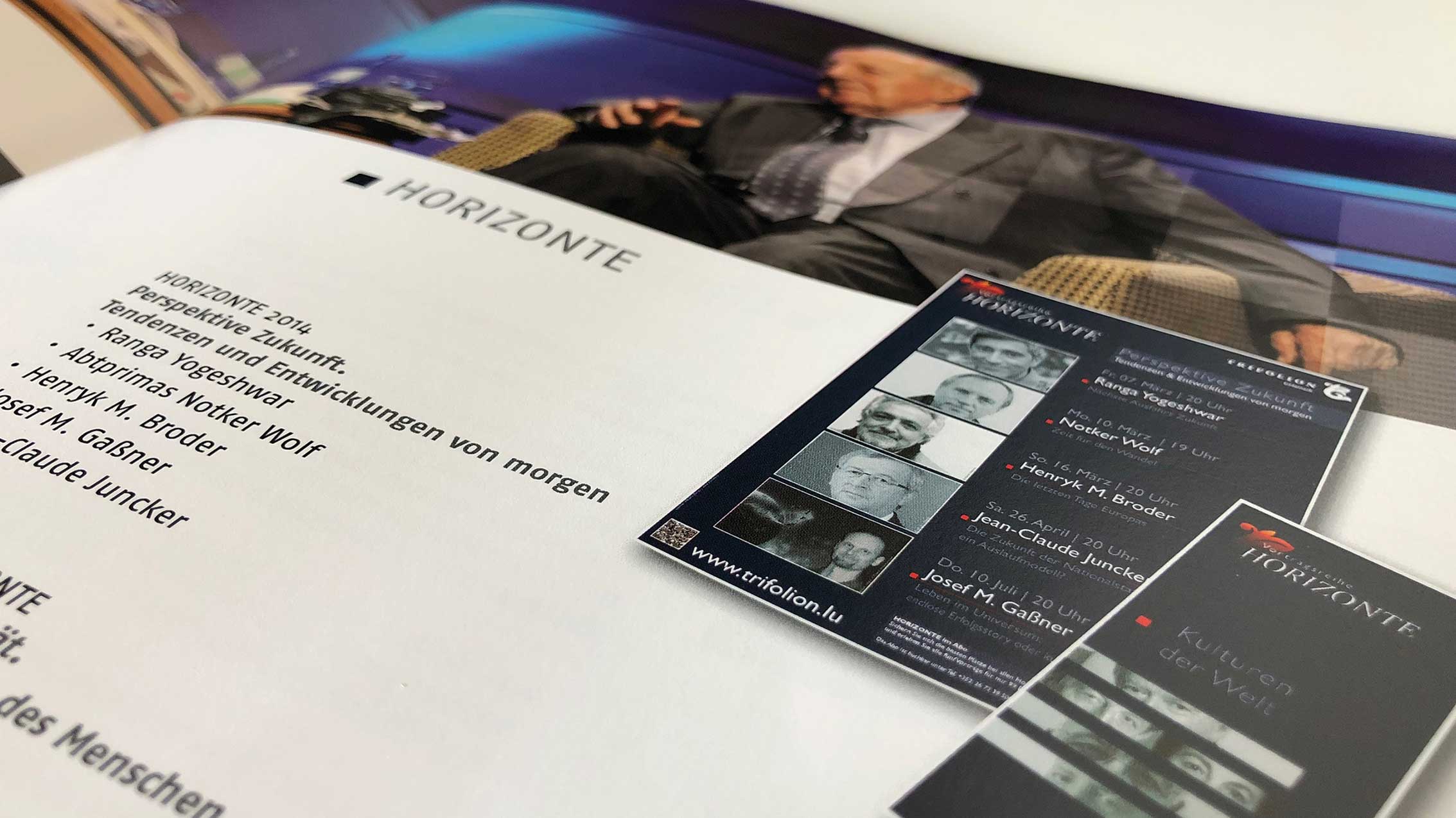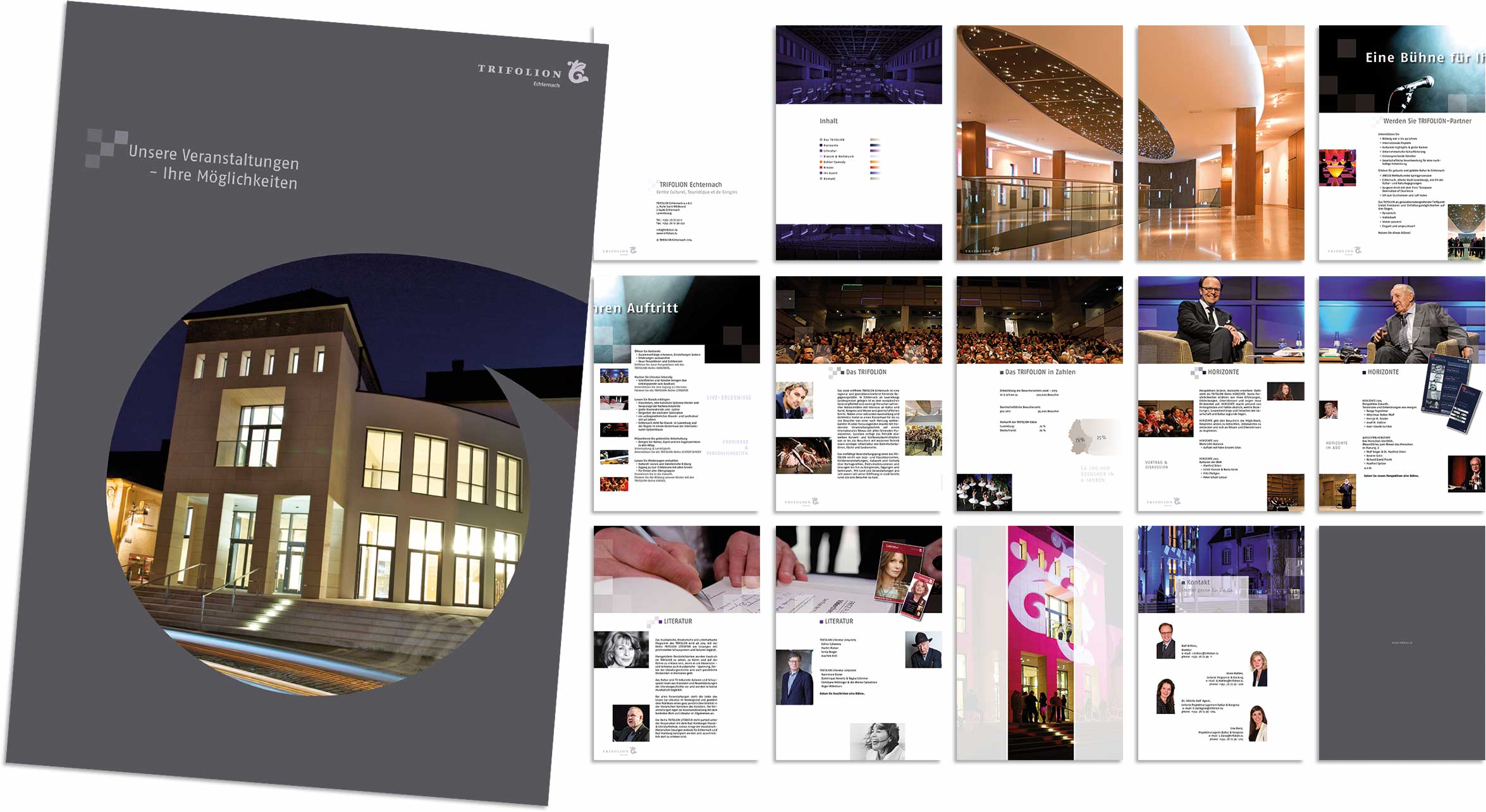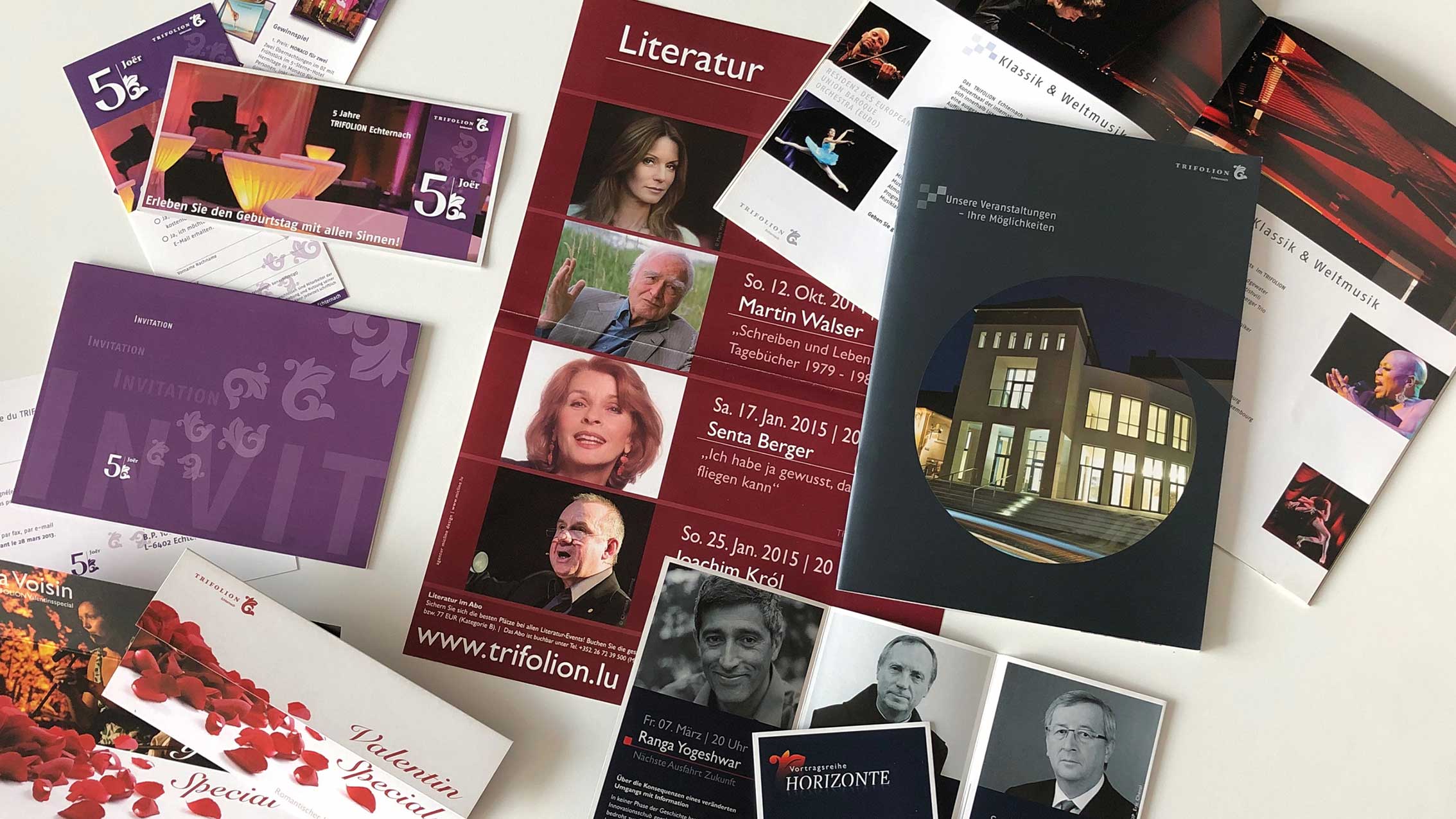 Creativity Support, Eventmarketing, Imagebroschüre, Drucksachen… Während der vergangen Jahre haben wir für das Trifolion Echternach Marken/Brands entwickelt. Das passende Logo wurde erarbeitet, ein Corporate Design aufgebaut, Farben und Schriften definiert, Vorlagen für Anzeigen- und Plakatserien sowie Veranstaltungskalender entwickelt, welche dann periodisch von uns mit gelieferten Inhalten gefüllt und im Anschluss produziert wurden.