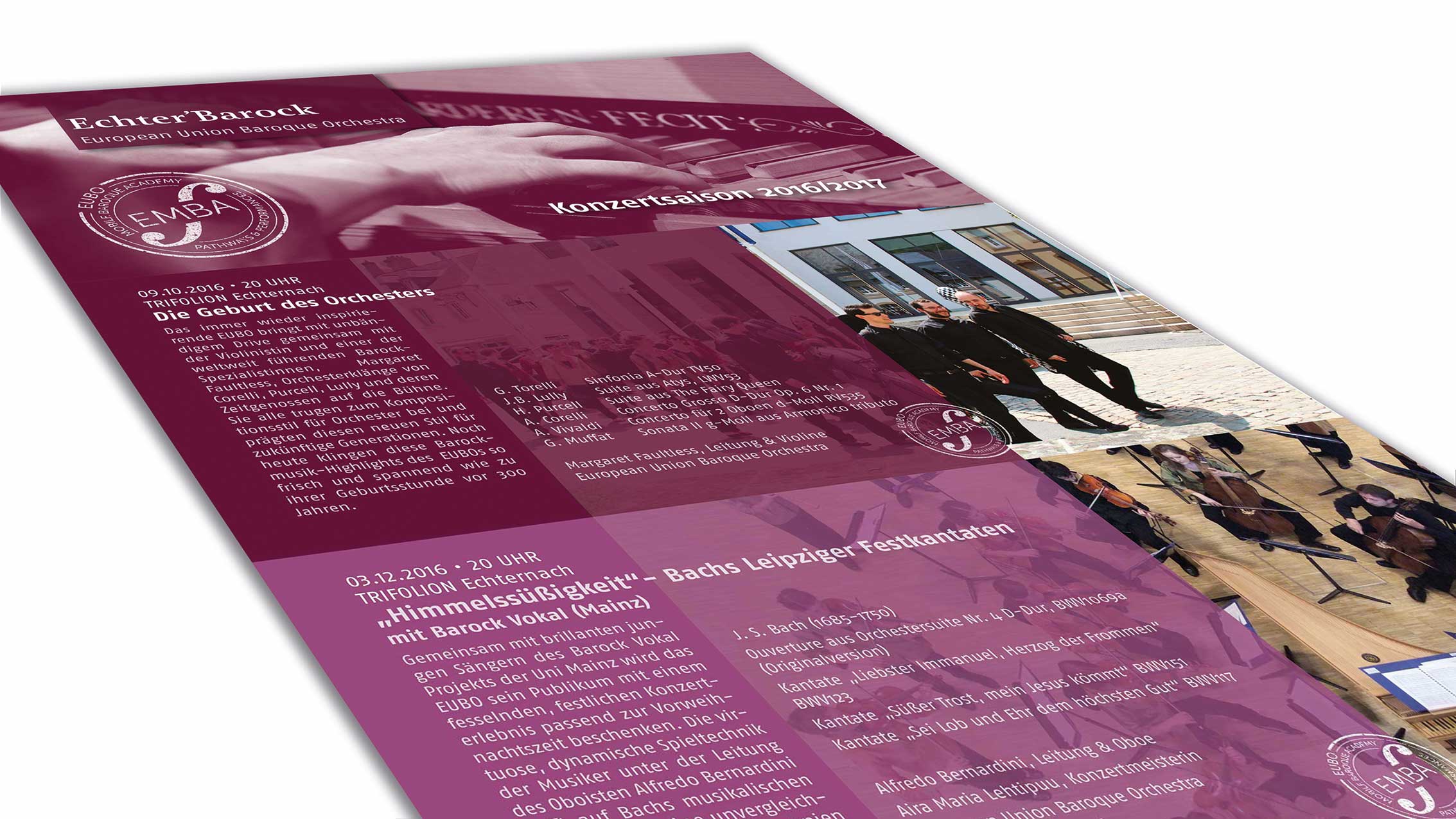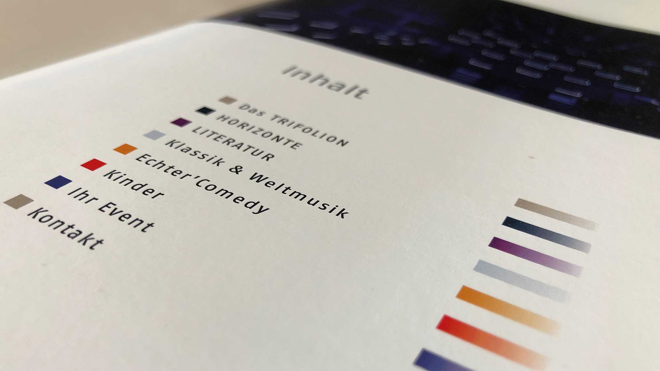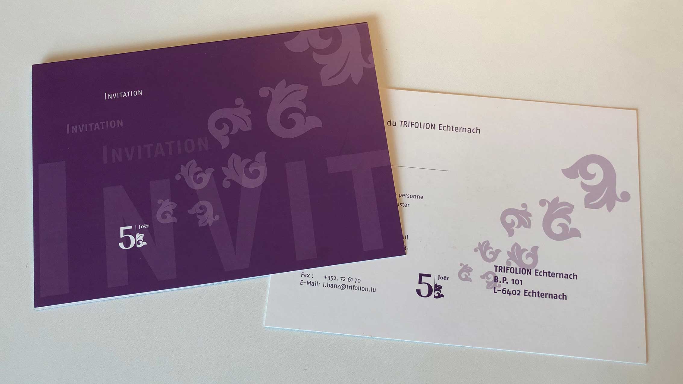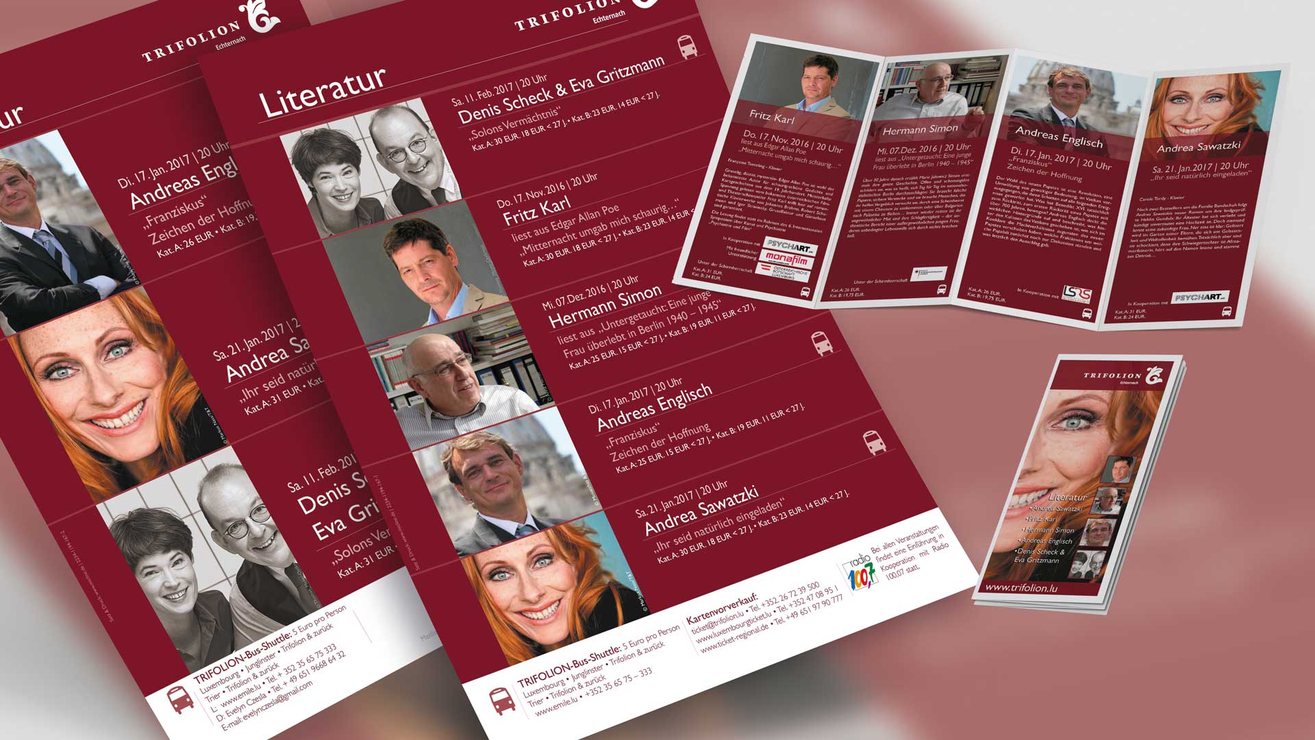 Creativity Support, Eventmarketing, Imagebroschüre, Drucksachen… Während der vergangen Jahre haben wir für das Trifolion Echternach Marken/Brands entwickelt. Das passende Logo wurde erarbeitet, ein Corporate Design aufgebaut, Farben und Schriften definiert, Vorlagen für Anzeigen- und Plakatserien sowie Veranstaltungskalender entwickelt, welche dann periodisch von uns mit gelieferten Inhalten gefüllt und im Anschluss produziert wurden.
